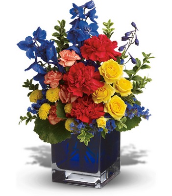 An artist's palette of color spontaneously bursts forth in this array of favorite flowers in a blue contemporary glass cube vase. Van Gogh, Renoir, Pollock - send this floral masterpiece to a colorful friend.